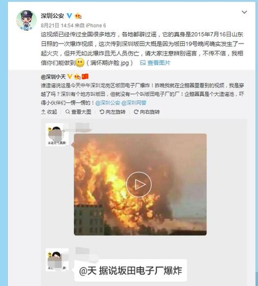8月21日14时54分许,深圳市公安局官方微博发布通报辟谣:这视频已经传过全国很多地方,各地都辟过谣,它的真身是2015年7月16日山东日照的一次爆炸视频,这次传到深圳坂田大概是因为坂田8月19日晚间确实发生了一起火灾,但并无如此爆炸且无人员伤亡。 深圳公安表示,希望网友注意辨别谣言,不传不信,“我相信你们能做到。”