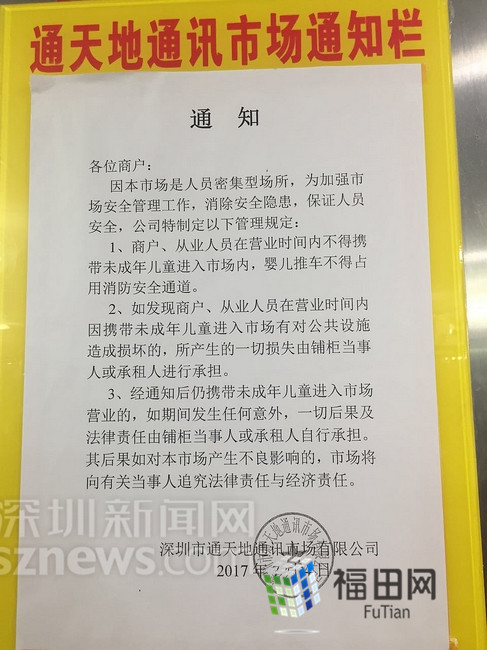 人员密集区域除了防火灾,防止发生踩踏事故也是一个重头戏。记者在市场的通知栏看到,深圳通天地通讯市场有限公司在7月4日发出通知,其中一条为“所有商户、从业人员不得在营业时间带未成年人进入市场,经通知后仍携带未成年人进入市场的,若未成年人在市场内发生意外,一切后果由铺柜当事人或承租人自行承担。”但在市场内,通道里有不少小孩跑来跑去。在一家摆有“专业修复大相头”的柜台里,坐着一个小男孩儿,低头玩着手机游戏。
