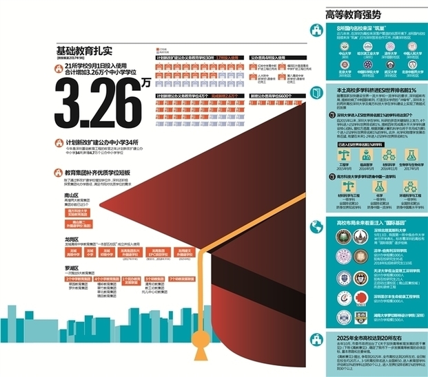 晶报记者从市教育局了解到,在国内高校布局方面,深圳着重引进位居国内综合排名前10、学科排名前5的名校来深合作办学。“来了就是深圳人”这个口号真实地反映在市委市政府对基础教育的深挖扩容上,也在高等教育板块奏响了迅猛发展的最强音。“办一所,优一所”“家门口上名校”……这些对深圳学子来说再也不是梦了,深圳这个曾被认为缺乏教育积淀的城市,已逐渐呈现出了基础教育扎实、高等教育强势的态势。
