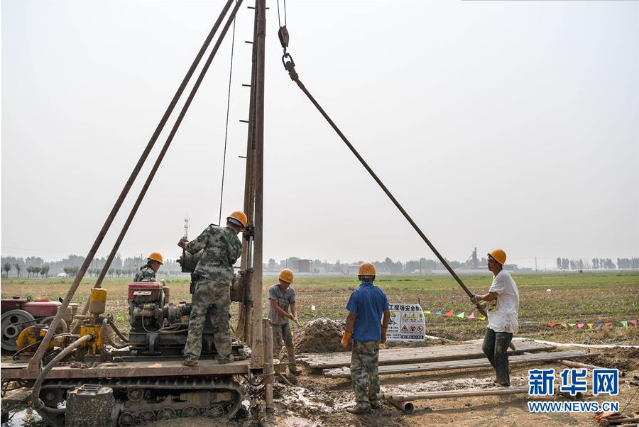 在河北安新县大王镇的地质调查现场,地质工作人员在采集土壤样本(2017年7月1日摄)。新华社记者 申宏 摄