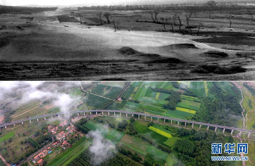 拼版照片:上图为治理前的山西省右玉县右卫镇的景象(资料照片);下图为现在山西省右玉县右卫镇一带的景象(2017年7月22日 新华社记者 詹彦 摄)。新华社发