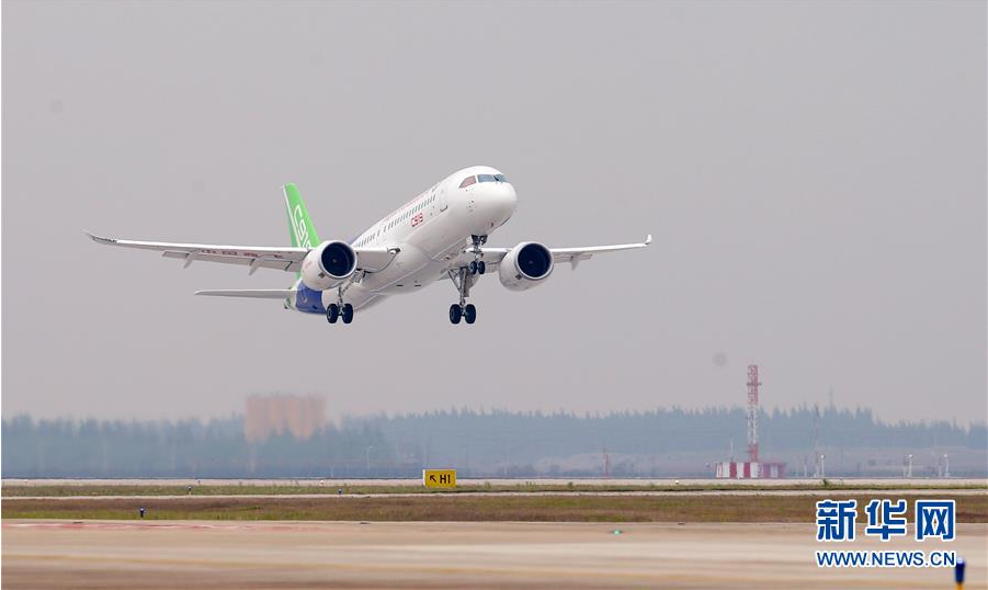 中国首款国际主流水准的干线客机C919在上海浦东国际机场起飞(2017年5月5日摄)。新华社记者 丁汀 摄