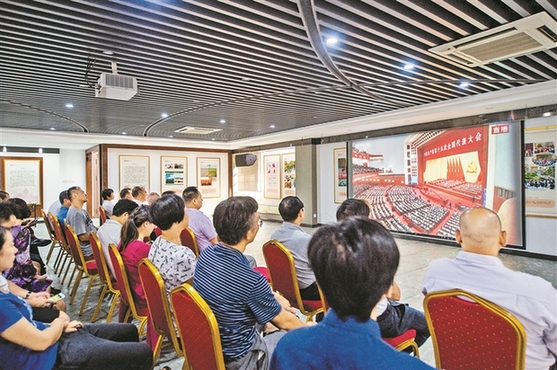 18日,渔邨社区党员干部近100人在渔民村村史馆集中观看了党的十九大开幕会的现场直播。深圳特区报记者 刘羽洁 摄