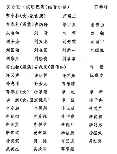 乙晓光 丁来杭 丁学东 丁薛祥 于伟国 于忠福 万立骏 习近平 马飚(壮族) 马兴瑞 王宁(武警) 王军 王勇 王晨 王毅 王小洪 王玉普 王正伟(回族) 王东明 王东峰 王尔乘 王志民 王志刚 王沪宁 王国生 王建军 王建武 王晓东 王晓晖 王家胜 王蒙 徽尤权 车俊 尹力 巴音朝鲁(蒙古族) 巴特尔(蒙古族) 艾力更·依明巴海(维吾尔族) 石泰峰 布小林(女,蒙古族) 卢展工 白春礼(满族) 吉炳轩 毕井泉 曲青山 朱生岭 刘奇 刘雷 刘鹤 刘士余 刘万龙 刘奇葆 刘国中 刘国治 刘金国 刘结一 刘振立 刘家义 刘赐贵 刘粤军 齐扎拉(藏族) 安兆庆(锡伯族) 许勤 许又声 许达哲 许其亮 阮成发 孙志刚 孙金龙 孙绍骋 孙春兰(女)杜家毫 李屹 李希 李斌(女,国家机关) 李强 李干杰 李小鹏 李凤彪 李玉赋 李传广 李纪恒 李克强 李作成 李尚福 李国英 李桥铭 李晓红 李鸿忠 李锦斌 杨学军 杨洁篪 杨振武 杨晓渡 肖捷 肖亚庆 吴社洲 吴英杰 吴政隆 邱学强 何平(解放军) 何立峰 应勇 冷溶 汪洋 汪永清 沈金龙 沈晓明 沈跃跃(女) 沈德咏 怀进鹏 宋丹 宋涛 宋秀岩(女) 张军(国家机关) 张又侠 张升民 张庆伟 张庆黎 张纪南 张国清 张春贤 张晓明 张裔炯 陆昊 陈希 陈武(壮族) 陈豪 陈文清 陈吉宁 陈全国 陈求发(苗族) 陈宝生 陈润儿 陈敏尔 努尔兰·阿不都满金(哈萨克族) 苗圩 苗华 苟仲文 范骁骏 林铎 尚宏 金壮龙 周强 周亚宁 郑和 郑卫平 郑晓松 孟祥锋 赵乐际 赵克志 赵宗岐 郝鹏 胡和平 胡泽君(女) 胡春华 咸辉(女,回族) 钟山 信春鹰(女) 侯建国 娄勤俭 洛桑江村(藏族)骆惠宁 秦生祥 袁家军 袁誉柏 袁曙宏 聂辰席 栗战书 钱小芊 铁凝(女) 倪岳峰 徐麟 徐乐江 徐安祥 高津 郭声琨 郭树清 唐仁健 黄明 黄守宏 黄坤明 黄树贤 曹建明 龚正 盛斌 雪克来提·扎克尔(维吾尔族) 鄂竟平 鹿心社 谌贻琴(女,白族) 彭清华 蒋超良 韩正 韩卫国 韩长赋 傅政华 谢伏瞻 楼阳生 蔡奇 蔡名照 雒树刚 黎火辉 潘立刚 穆虹 魏凤和