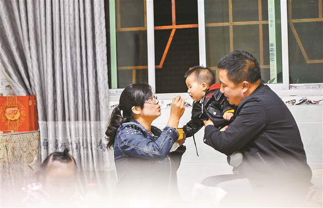 10月31日,忙完工作后回到家时间已近20点,严克美与丈夫一起给小女儿喂饭,此时此刻幸福满满。