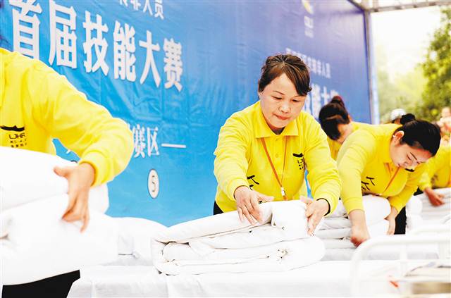 11月2日,在重庆市两江新区举行的“农转非”人员技能大赛,参加养老护理项目竞赛的选手正在整理床上用品。