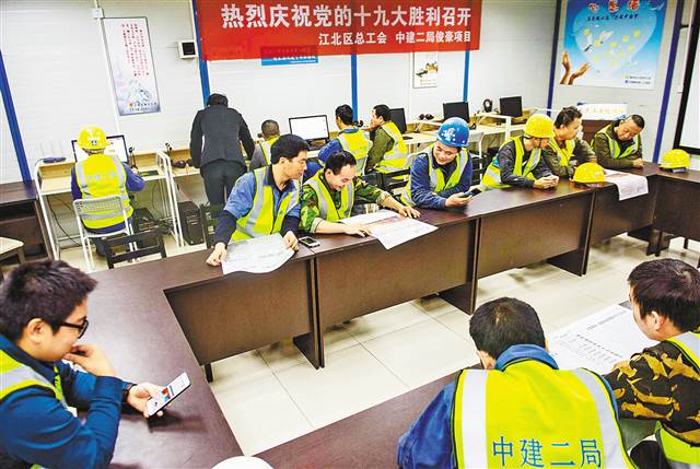 重庆市江北嘴中建二局工地农民工夜校的学员在课间关注十九大相关新闻。他们通过夜校的培训,成为了有技能有文化的新型工人。 记者崔力摄