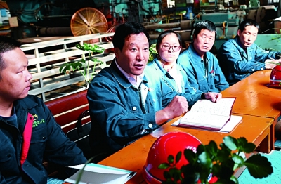 自北京回到云南后,十九大代表、云南冶金昆明重工有限公司首席技师耿家盛就一直处于马不停蹄的状态。图为耿家盛(左二)在向工友们介绍参加十九大的感受。新华社发