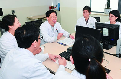 党的十九大代表、河北省眼科医院院长张铭连,自从返回单位就开启连轴转“宣讲”模式。图为张铭连代表(中)在河北省眼科医院向医生宣讲十九大精神。新华社发