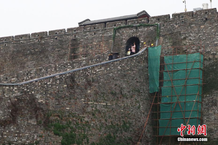 1月2日,工人在南京明城墙解放门段进行墙体维修。为推动申遗并加强对明城墙的保护,南京计划投资建设城墙监测预警平台,全程监控明城墙的健康状况,发现问题提前预警。中新社记者 泱波 摄