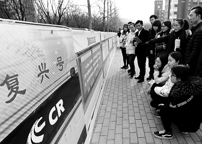山东青年政治学院师生观看“复兴号”十九大精神展板。资料图片