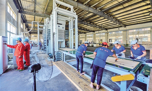 浙江湖州市南浔区一家木地板企业的工人使用“电能替代”改造后的热压机加工木地板。 新华社记者 徐 昱摄