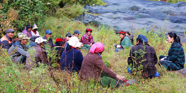 错那县麻麻乡乡长(右一)正在茶园里与群众交流集体经济发展的事宜。通讯员 伍小龙 记者 刘枫 摄