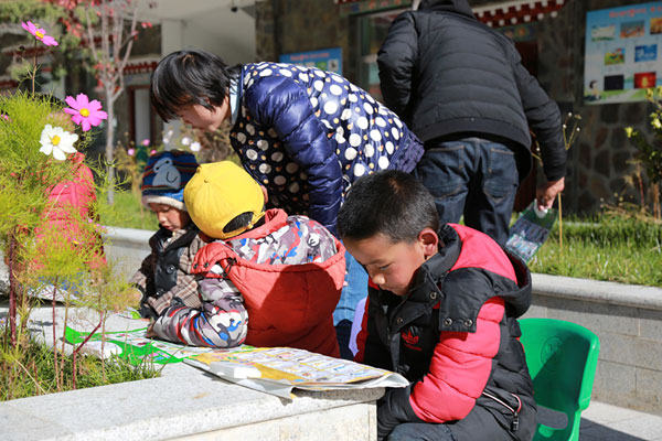麻麻村小学的学生们正在花坛边安静地看画报。通讯员 伍小龙 记者 刘枫 摄