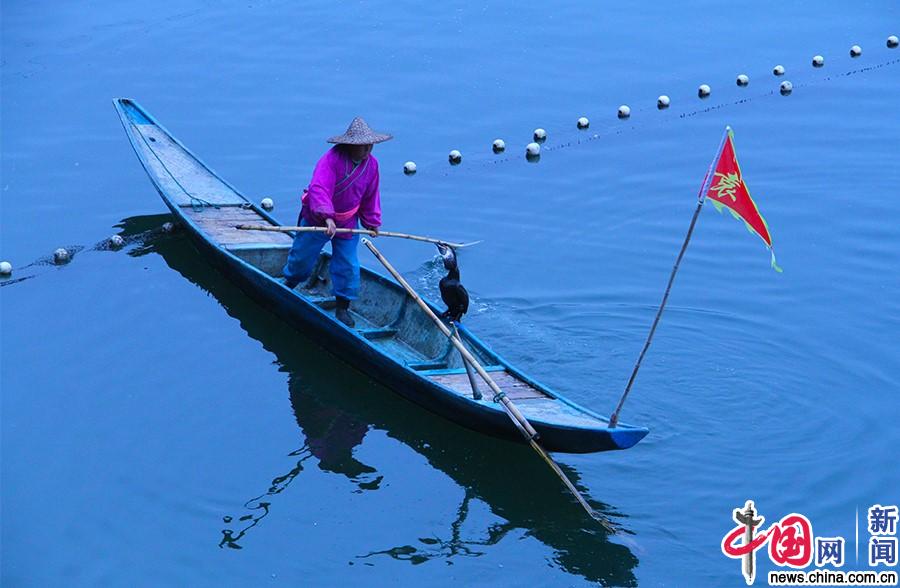 2018年1月19日,安徽省黄山市歙县的“新安江山水画廊”,村民利用鱼鹰捕鱼。中国网记者董小迪 摄