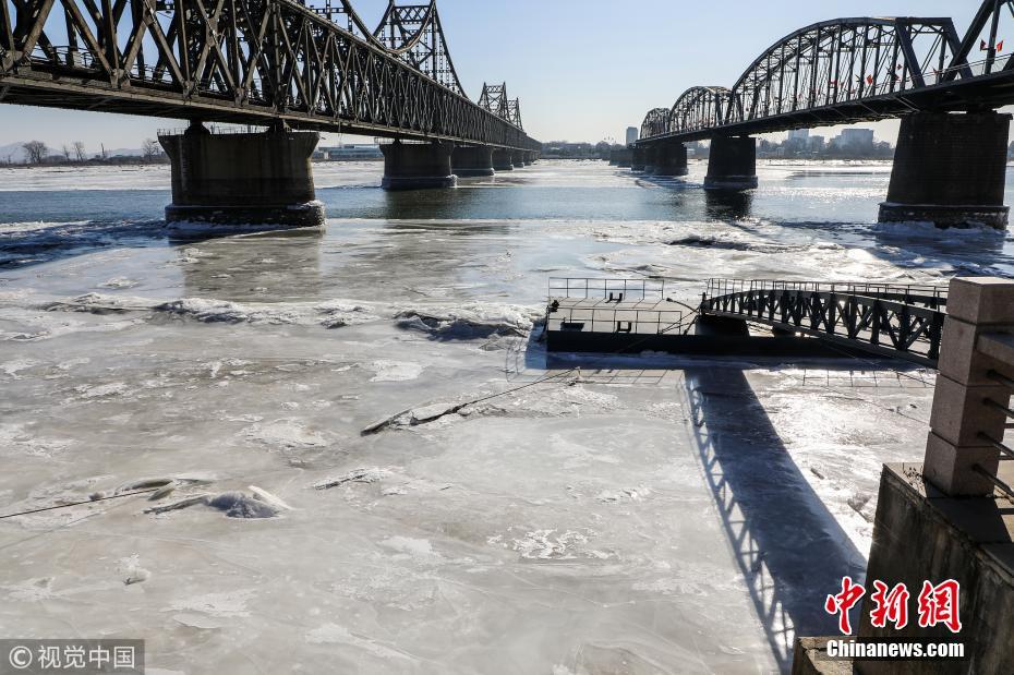 鸭绿江丹东市区段,中朝友谊桥和鸭绿江断桥附近,仅有两个桥墩之间宽度的水域没有结冰。鸭绿江公园景区的游船均被冰冻在岸边浅滩。据景区工作人员介绍,乘船游鸭绿江项目因结冰而暂停,但赴朝旅游和鸭绿江断桥游仍正常进行。图片来源:视觉中国