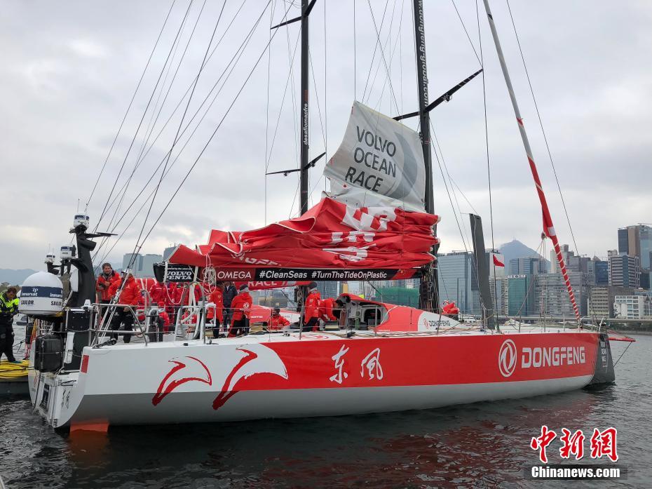 1月29日,沃尔沃环球帆船赛中国赛队在香港启德邮轮码头举办“东风号”主题活动。图为“东风号”停泊在香港维多利亚港。2017-18赛季沃尔沃环球帆船赛第四赛段已结束,7支船队陆续抵达中国香港站,中国赛队“东风队”不负众望斩获亚军,成为本赛季唯一一支连续四次登上领奖台的船队。中新社记者谢光磊 摄