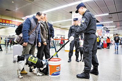 民警带着警犬在广州火车站地铁站内抽检旅客行李,防止易燃易爆物品被带入。广报全媒体记者苏俊杰 实习生林泽君 摄