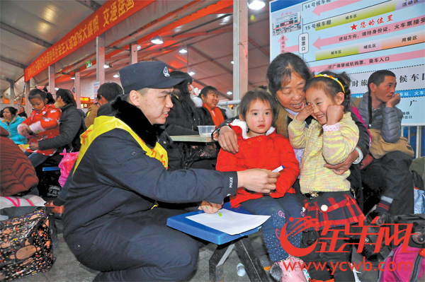 “我看看。”晚上9点半,在火车站广场棚外候车区,广州火车站广场派出所四级警长何sir接过一名旅客递过来的车票。他穿着警服、反光背心,在人群中格外显眼。旅客找厕所、找地铁、找公交车、找的士……高峰期,每分钟至少被10个人拦住问。
