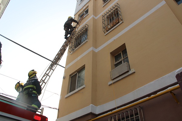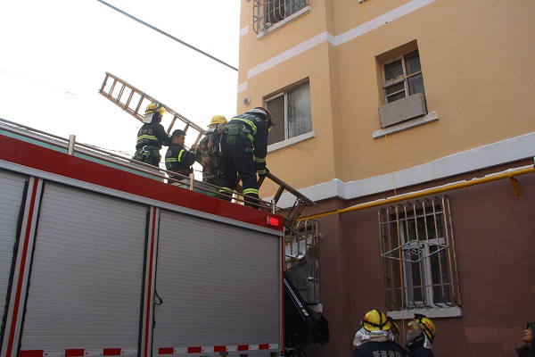 开发区中队接到求助后,立即出动一辆抢险救援车,火速赶往现场。到场后,中队指挥员对现场情况进行勘察:该住户家的门是五点锁闭式,而且还自己加装了一把锁,房门从里面反锁着,虽然防盗门的锁芯已被开锁公司撬坏,但房门依然无法打开;同时考虑到天气寒冷及楼顶空间狭小不便架设金属拉梯进行高空作业,于是决定利用9米拉梯架设在抢险救援车上,同时利用两根保护绳对金属拉梯及救援战士做好支点保护。顺着拉梯,救援战士很快爬上该住户家厨房窗户位置,所幸该住房没有安装防盗窗,战士得以快速破窗而入,顺利打开房门。