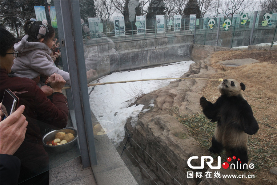 国际在线消息(记者陈彦)2月19日农历戊戌狗年正月初四,在山东省威海市刘公岛景区内,大熊猫“竹灵”和“宁宁”正在欢度它们到威海后的第八个春节。这一天,它们迎来了一批专程来陪它们过年的贵客。