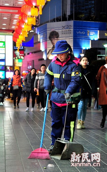 【南京路上最热闹】我是周娟,在黄浦区欣谊保洁公司做清道工。我老家在江苏淮安,已连续8年没有回家过年了,爹妈特别想我,我也梦想回家过年。但是每逢年节,南京路步行街上游客如潮,五湖四海的游客比平常多出好几倍,这是我一年中清扫工作最忙碌的时候。南京路是大上海的“名片”,我和我的同事们必须让这张“名片”保持得清清爽爽。如今,社会各界都很体贴我们环卫职工,我们作为上海的“城市美容师”,更有责任让大都市变得整洁美丽哦!(杨建正摄)