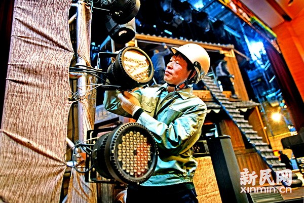 【观众称心最自豪】我是林建飞,人民大舞台的舞台部工程技术人员,家就在不远的江苏启东。我家里有80多岁的老父亲、妻子和女儿,我也渴望回家与亲人团聚啊!但是,新年里剧院的演出表都安排得满满当当,真可谓丰富多彩。为了确保剧院的正常运作,我就主动“留守”在剧院加班。每场演出前夕,我都对所有的舞台灯光、演出道具一一检验,任何不安全的蛛丝马迹都不放过。所以,人民大舞台的同事们都给我起了一个外号“林放心”。是呀,我的工作虽然普普通通,但是必须让观众们放心和称心!(本报记者郭新洋 摄)
