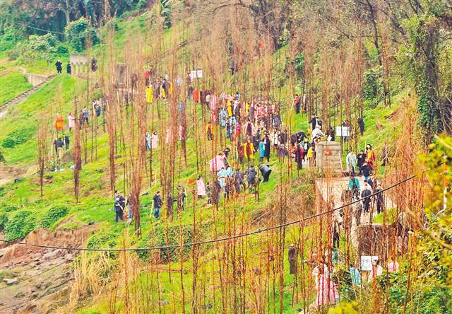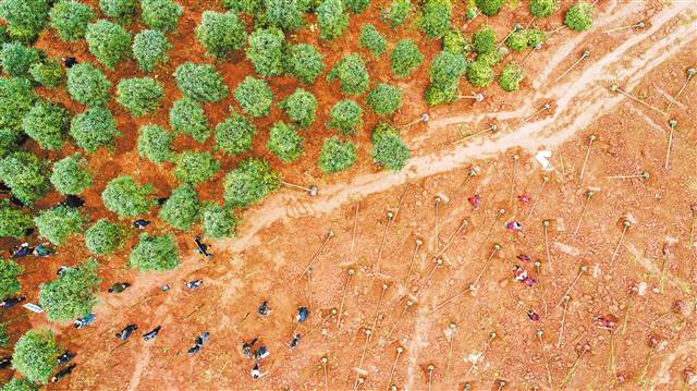 2月22日,合川区机关干部在涪江支流小安溪坡岸植树造林。当日,在嘉陵江、渠江、涪江三江汇流的合川,机关干部和青年志愿河长“河小青”在沿江沿溪的山坡山峦植树造林,“染绿”三江六岸,“增密”溪河两岸植被。各镇街3600余名机关干部和上千名志愿者栽种桂花、香樟、红枫、木芙蓉等树苗3万余株。记者万难 摄