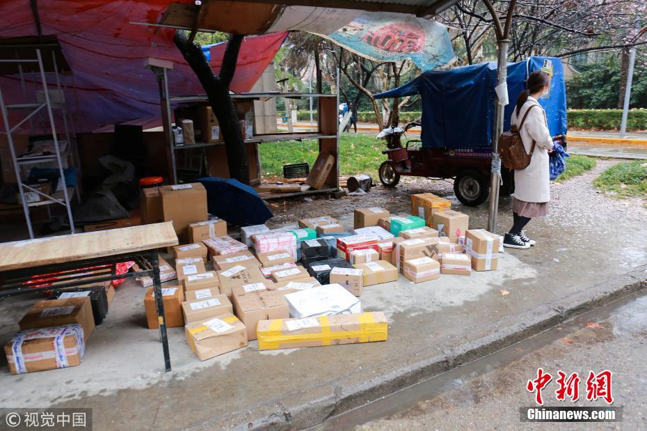 3月4日,西安交通大学兴庆校区内,学生区西15宿舍前不足百米的街道,有不同品牌的十余个快递驻扎点,方便学生收取快递。一佳one 摄 图片来源:视觉中国