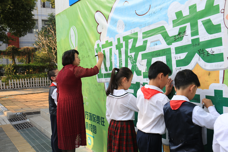 “垃圾分类,从我做起”,学校组织全校老师和学生有序进行了学习签名活动。从签满名字的垃圾宣传板可以看出,大家的环保意识在不断提高,都想成为环保达人,保护环境,共建绿色家园。