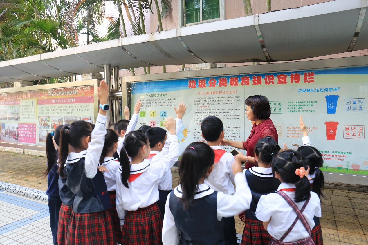班主任带领班级学生到垃圾分类教育知识宣传栏,进行垃圾分类知识讲解,或者推选出班级小小讲解员,就如何进行垃圾分类以及怎么分类等相关问题进行现场宣传。校道里,学生队伍井然有序,同学们个个聚精会神,互动环节也是响应积极,氛围浓厚。