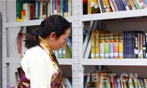 图为泽仁永宗接受采访间隙阅览图书。摄影:杨月云