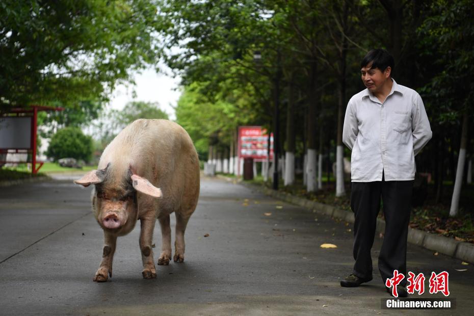 4月23日,生活在四川建川博物馆的汶川地震“猪坚强”在专职饲养员龚国成的带领下,走出圈舍来到户外散步。“5.12”汶川地震发生后,成都彭州龙门山镇村民万兴明家的大肥猪被埋废墟下36天后被刨出,并奇迹般地生存了下来。随后,“猪坚强”被建川博物馆买下并在博物馆度余生,如今已到11岁,相当于人类80岁高龄。2018年1月,“猪坚强”受伤倒地无法站立,经过博物馆的医治和照料,如今又重新站立了起来,并恢复一天两次外出散步计划。中新社记者 张浪 摄