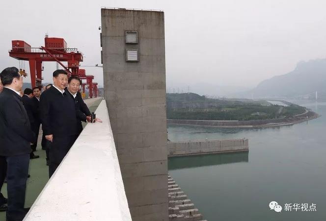 (4月24日下午,中共中央总书记、国家主席、中央军委主席习近平来到三峡大坝,详细了解三峡工程建设、发电、水利、通航、生态保护等方面的情况。这是习近平在坝顶察看三峡工程全貌和坝区周边生态环境。新华社记者鞠鹏摄)