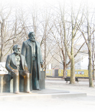 位于德国柏林亚历山大广场一隅树丛内的马克思与恩格斯雕像。