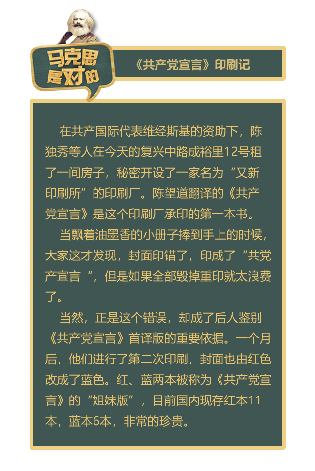 从1920年至今,《共产党宣言》在中国不断地被重新翻译和诠释,目前共有二十多种中文译本,见证了中国共产党对马克思主义基本原理的认识不断地精益求精,不断地与时俱进。