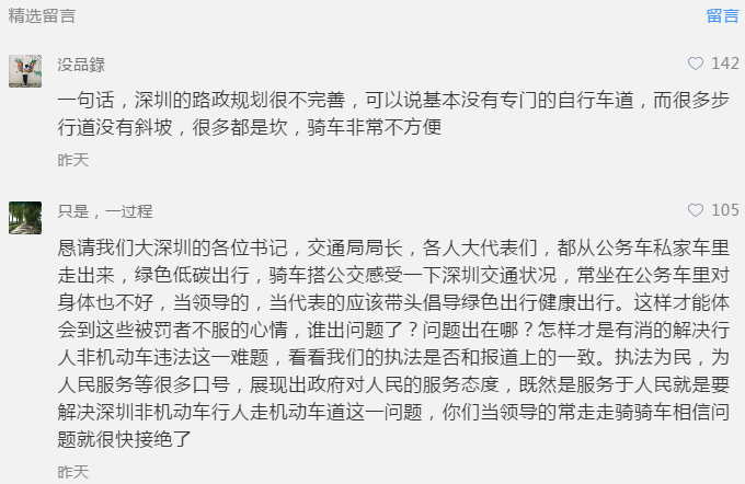 深圳新闻网5月16日讯(记者 涂胜)近日,网友“无意原来”在微博写下《以后在深圳大鹏骑自行车,当心被稀里糊涂罚款》一文,并@深圳交警。该网友讲述自己在大鹏鹏飞路段机动车道内,骑自行车被罚50元的全过程,并分析了鹏飞路非机动车道相关情况。文章发出后,深圳交警进行了回应。深圳新闻网对此事进行报道后,引发大量网友对深圳非机动车道设置不合理现象的吐槽,截至5月16日下午5点,报道点击超5万,网友评论超过700条。