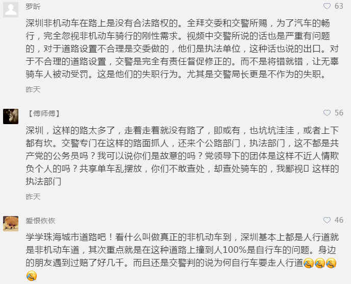 以执法视频回应网友,可以说是相当直接明了。此外,根据《中华人民共和国道路交通安全法》第八十九条规定:行人、乘车人、非机动车驾驶人违反道路交通安全法律、法规关于道路通行规定的,处警告或者5元以上50元以下罚款;非机动车驾驶人拒绝接受罚款处罚的,可以扣留其非机动车。从执法的角度看,实际上深圳交警并没有执法上的漏洞。