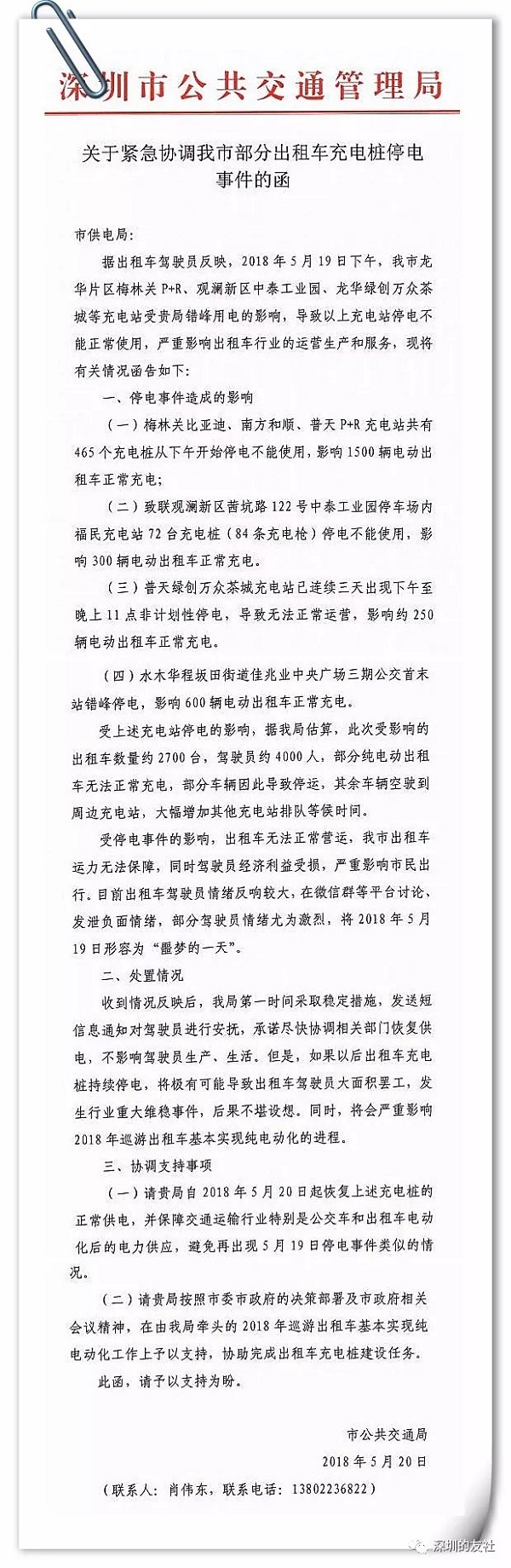 另外,一份网传的《关于紧急协调我市部分出租车充电桩停电事件的函》则显示,5月19日下午,龙华片区梅林关P+R、观新区中泰工业园、龙华绿创万众茶城等充电站受供电局错峰用电计划的影响不能正常使用。