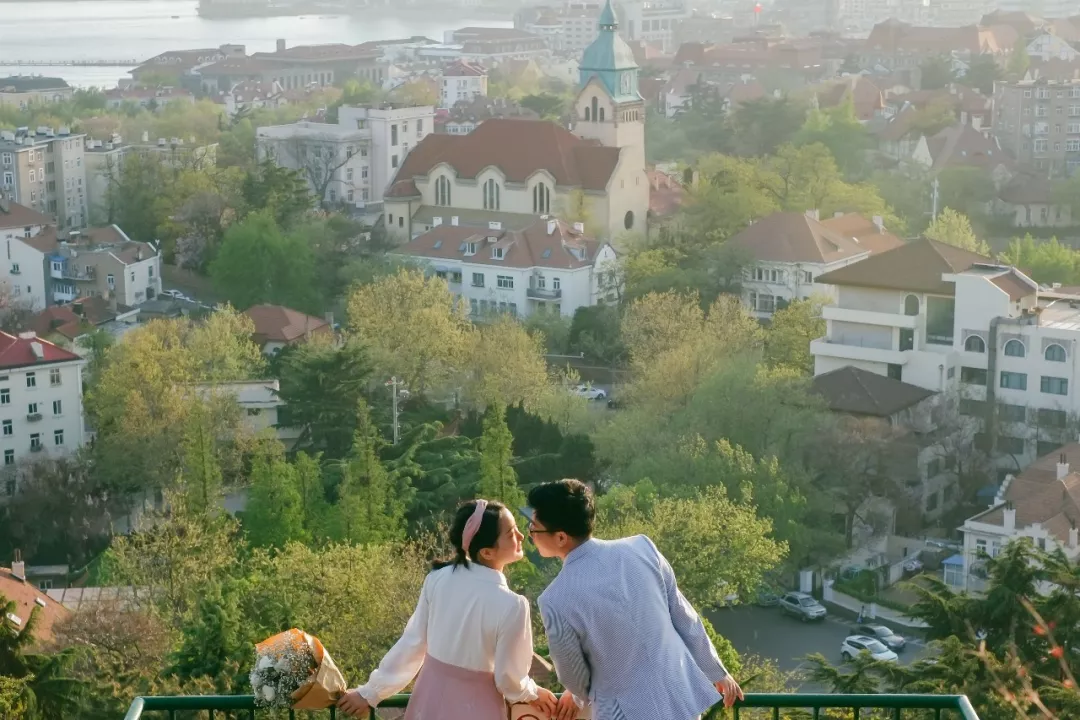 一对情侣在信号山拍摄新婚照(新华社记者 张铖 摄)