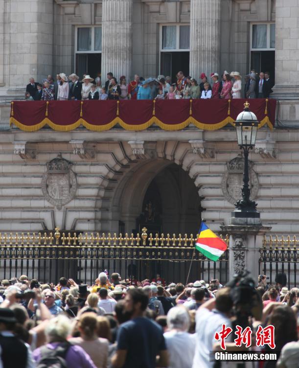 6月9日,英国女王伊丽莎白二世92岁生日官方庆典“皇家军队阅兵式”在伦敦白金汉宫隆重举行,英国民众观礼踊跃,现场人数比去年增加一倍。图为女王率皇室成员在白金汉宫阳台上,与成英国民众一起观礼。中新社记者 张平 摄