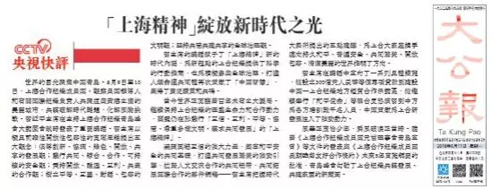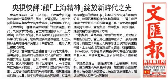 6月11日,香港《大公报》和香港《文汇报》同时转发了中央广播电视总台央视新闻刊播的《央视快评》。文章指出,6月9日至10日,上海合作组织青岛峰会在美丽的海滨城市青岛举行,国家主席习近平在主持上海合作组织青岛峰会大范围会谈时,发表题为《弘扬“上海精神” 构建命运共同体》的重要讲话,赋予了“上海精神”新的时代内涵。报道内容如下: