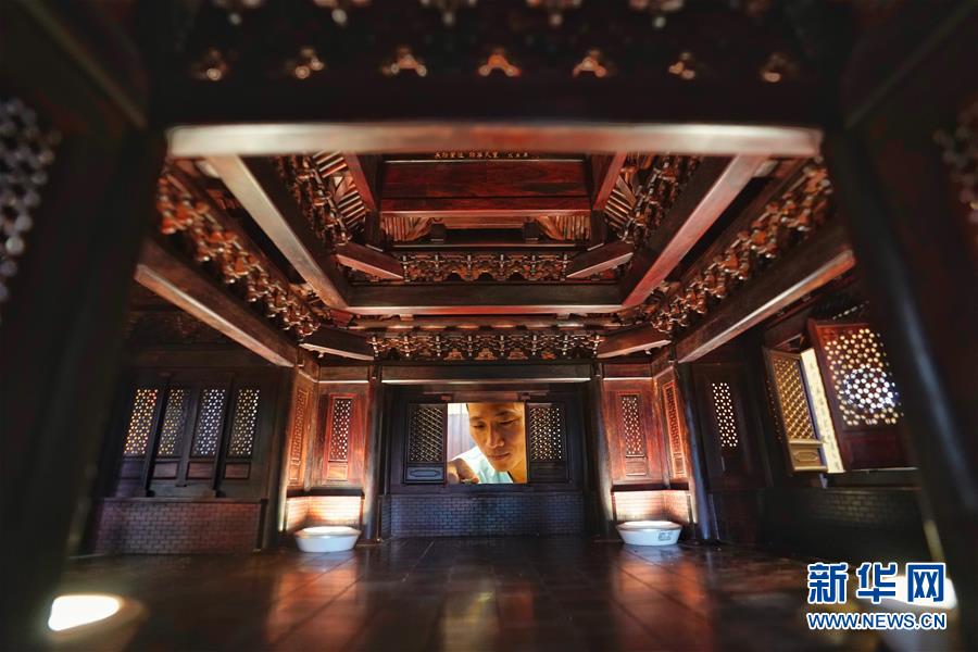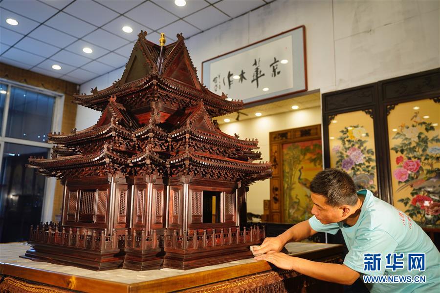 6月18日,李长久在位于河北省大城县的京华木作红木家具厂保养故宫角楼模型。河北省大城县京华木作工艺团队的李长久带领同事,以檀香紫檀为原料,建成了1:16故宫角楼模型。李长久和同事们耗时一年多,打磨数万个零件,榫卯结构连接,用匠心传承中华传统文化。新华社记者邢广利摄