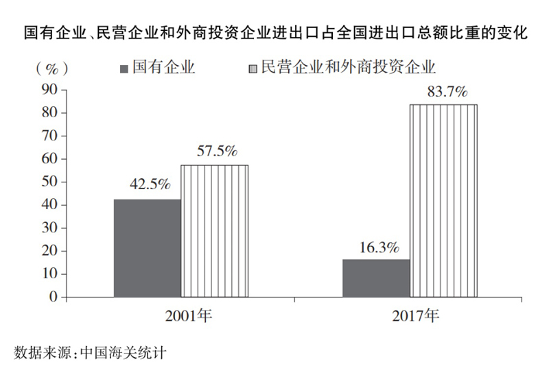 全面放开外贸经营权。促进经营主体多元化,激发各类企业开展贸易的积极性。自2004年7月起,中国对企业的外贸经营权由审批制改为备案登记制,极大地释放了民营企业的外贸活力,民营企业进出口发展迅速,份额持续扩大,成为对外贸易的重要经营主体。民营企业和外商投资企业进出口占全国进出口总额的比重由2001年的57.5%上升到2017年的83.7%。2017年,作为第一大出口经营主体的民营企业出口占比达46.6%。
