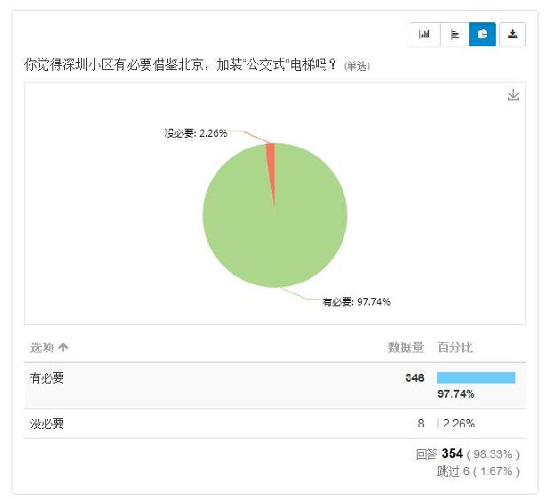 近日,深圳新闻网就市民热议的北京“公交式”电梯展开网友调查。据统计,一共有354位网友参与调查,其中346位网友表示深圳有必要借鉴北京模式,占总人数的97.7%。有8位网友觉得没这必要,占总数的2.3%。