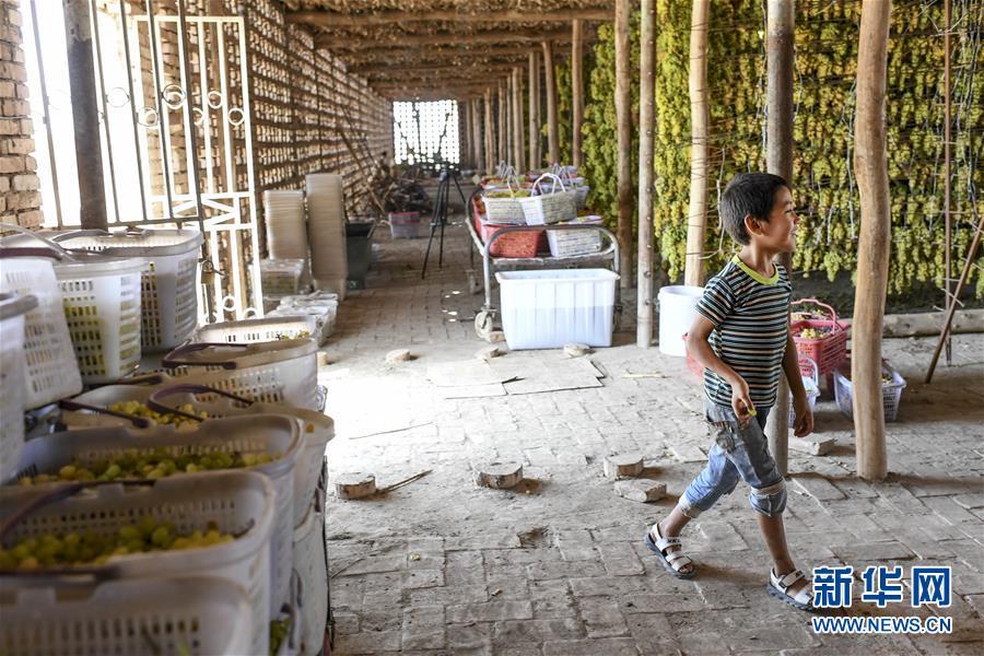 在新疆吐鲁番市高昌区葡萄镇,一名小朋友在自家晾晒葡萄干的晾房内吃葡萄(2017年8月28日摄)。 新华社记者王菲摄