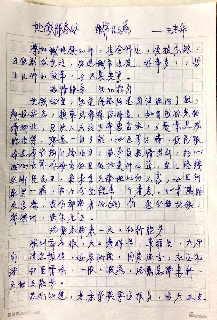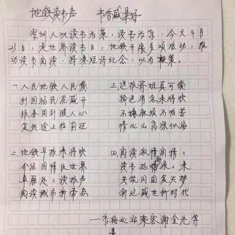 通过交谈,我们了解到您曾是解放军通讯员,热爱生活,热爱写作。再次受到您的作品,使全站员工感受您对地铁服务的肯定及对深圳地铁未来发展的美好期盼!