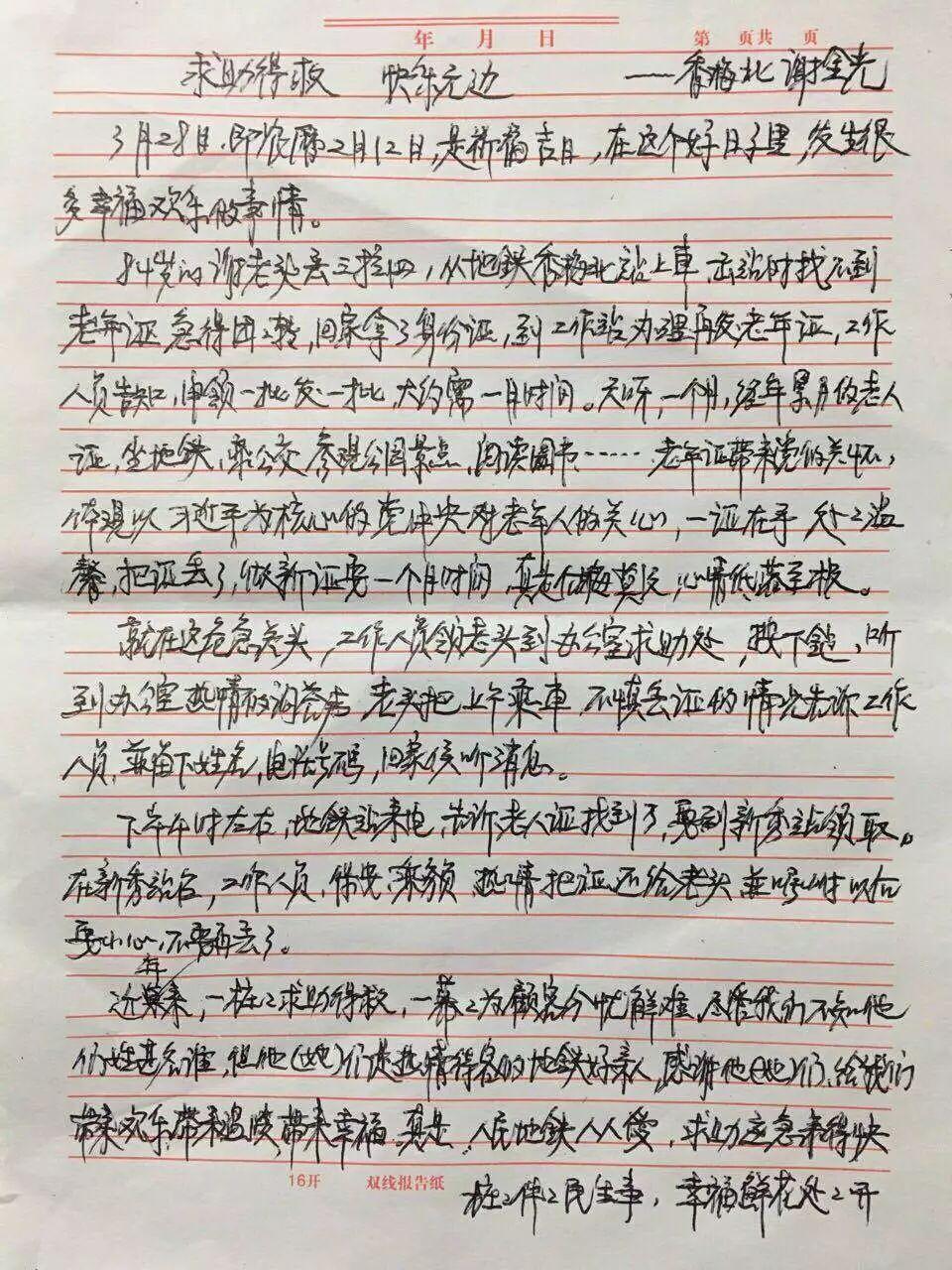 对于地铁工作人员来说,帮助乘客寻找失物本是日常工作中经常会遇到的,不曾想两天之后您给我们写了封感谢信,字里行间表达了对地铁服务的肯定与表扬。