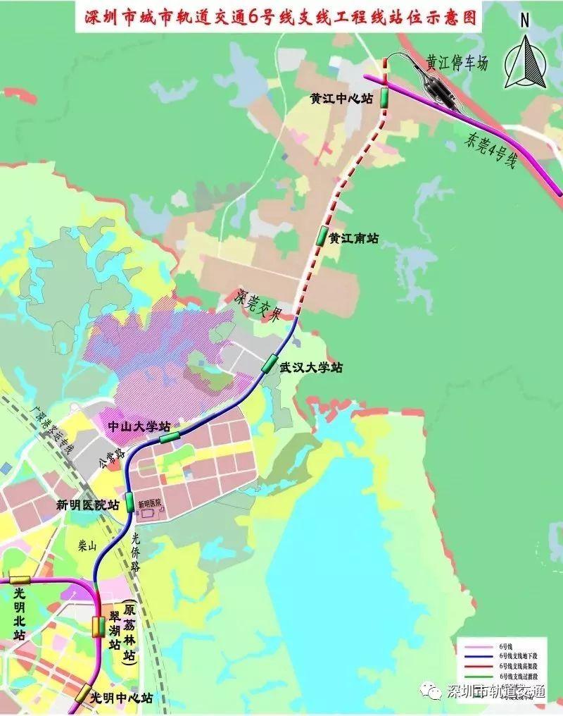深圳地铁6号线支线位于深圳市光明区,起点设在6号线翠湖站东侧(翠湖站为两线换乘车站)、终点位于公常路深莞边界,连接光明中心区和光明北区、中山大学,与规划建设的东莞1号线南延线衔接,包括4站4区间:翠湖站(原荔林站)、新明医院站、中山大学站、武汉大学站。