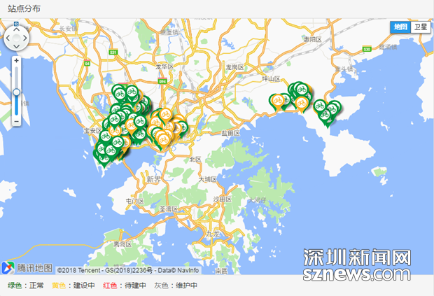其中福田区公共自行车站点显示,25个站点颜色为黄色,表示正在建设中